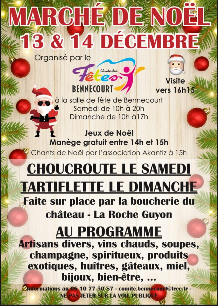 Bennecourt est un village des Yvelines, situé sur les bords de Seine. Le CDF de Bennecourt organise des animations à l’intention des plus grands comme des tous petits : Foire-à-tout, soirées à thèmes, arbres de Noël, feux d’artifice, lotos, thés dansant… rythment ainsi la vie du village. Le CDF est une association « loi 1901 » : Son financement est assuré, principalement, par les recettes de la foire-à-tout, marché de Noel, nous avons également une subvention de la mairie de Bennecourt qui permet de financer le feux d’artifice.